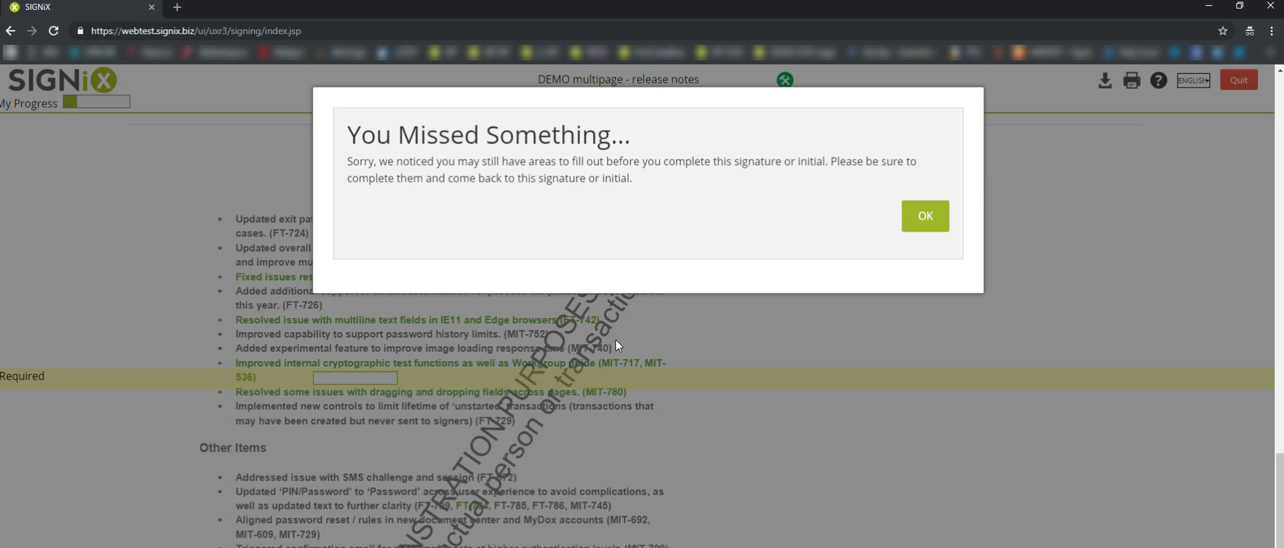 If the signer gets ahead of the fields required to be filled out, we've enhanced our capability to let the signer know which fields need to be filled in before signatures can be completed. We'll now highlight those fields and move the signer to that position in the document.